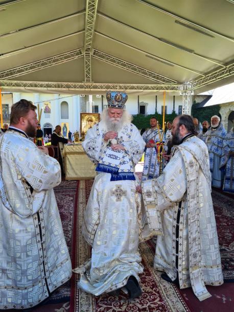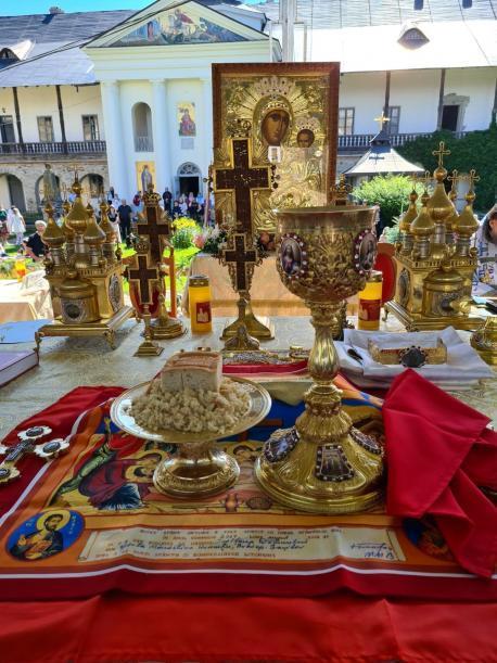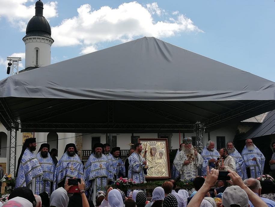În ziua hramului, la revărsatul zorilor, cerul, luminat de un soare strălucitor, a prevestit măreția sărbătorii, dar și lumina credinței mulțimilor de pelerini care, încă de dimineață, au venit să-i mulțumească Împărătesei celei preabune pentru multele binefaceri primite. La un moment dat, vestitul dangăt al secularelor clopote ale lavrei spintecau ritmat tihna văzduhului, vestind intrarea în biserică a ierarhului. Și în acest an, Episcopul-vicar al Arhiepiscopiei Iașilor, Preasfințitul Calinic Botoșăneanul, a venit la Mănăstirea Neamț ca să o preacinstească pe maica Arhiereului Veșnic, Hristos Dumnezeu. După îndătinata închinare și înveșmântare, soborul de preoți și diaconi condus de către Preasfințitul Părinte Calinic, purtând în procesiune Sfânta Icoană a Maicii Domnului, s-a îndreptat către locul special amenajat și frumos împodobit cu flori din curtea interioară a mănăstirii, unde s-a desfășurat întreg programul liturgic al sărbătorii.